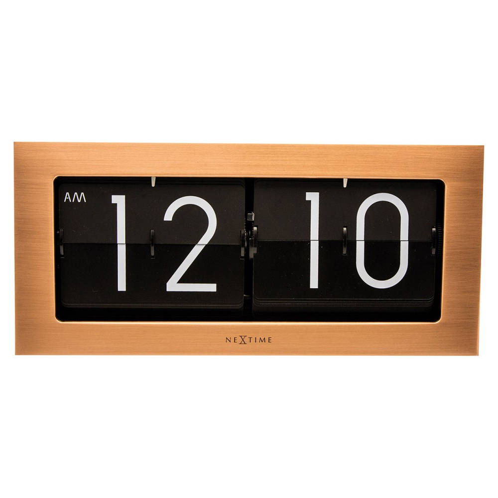 • Klok NE5198CO is een grote flip klok in een koperkleurige mat stalen uitvoering met witte cijfers op zwarte bladen.