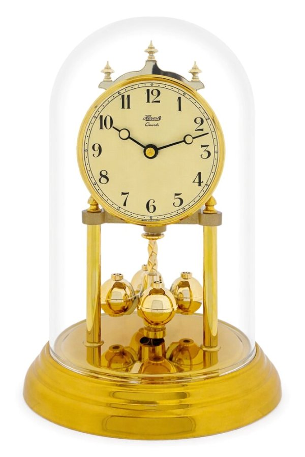 • Klok 82253-000977 is een jaarpendule stolpklok in een messing gekleurde uitvoering met een glazen stolp.