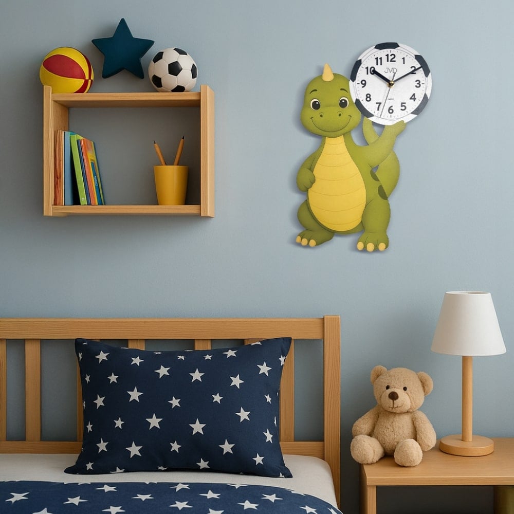 • Klok HJ111J is een bedrukte kinderklok wandklok van hout in de vorm van een dinosaurus.