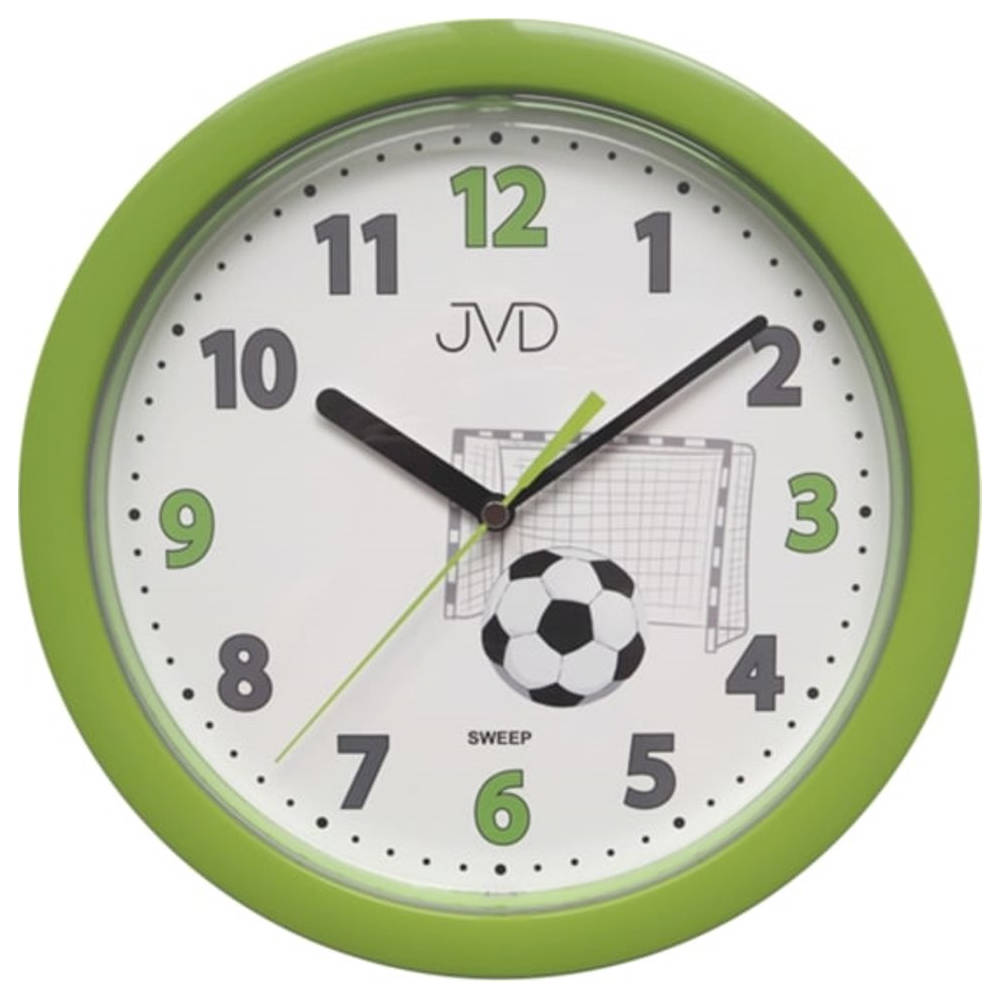 • Klok HP612-D4J is een kinderklok met een groene kunststof rand en een voetbal en goal op de wijzerplaat afgebeeld.
