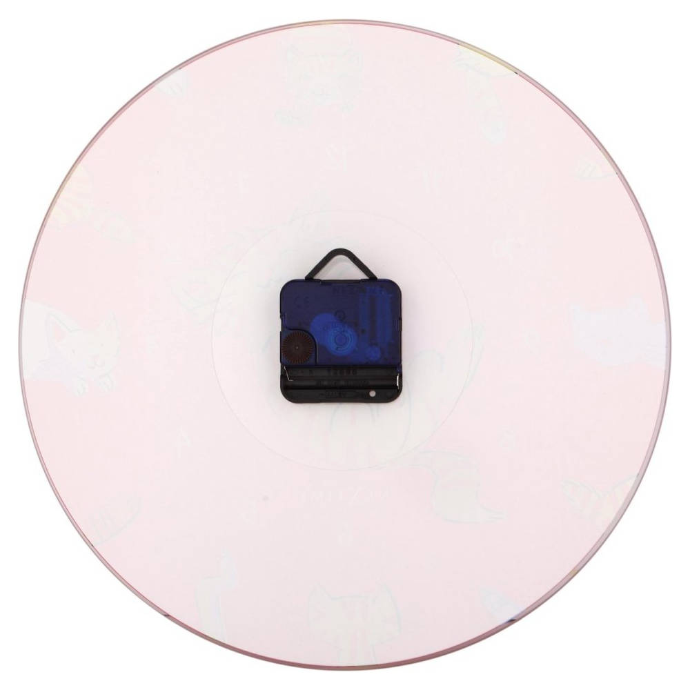 • Klok NE8810 is een wandklok in een roze bedrukte glazen uitvoering met een slapende kat in het midden en katten en staarten als urenmarkeringen.