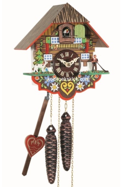 Deze koekoeksklok is uitgerust met een 1-daags mechanisch uurwerk dat functioneert op twee gewichten, die eenmaal per dag moeten worden opgetrokken. Het uurwerk maakt gebruik van een verfijnd systeem van tandwielen, gewichten en een slinger om de tijdsweergave en de koekoeksroep nauwkeurig aan te sturen.