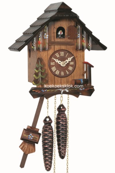 Deze koekoeksklok is uitgerust met een 1-daags mechanisch uurwerk dat functioneert op twee gewichten, die eenmaal per dag moeten worden opgetrokken. Het uurwerk maakt gebruik van een verfijnd systeem van tandwielen, gewichten en een slinger om de tijdsweergave en de koekoeksroep nauwkeurig aan te sturen.