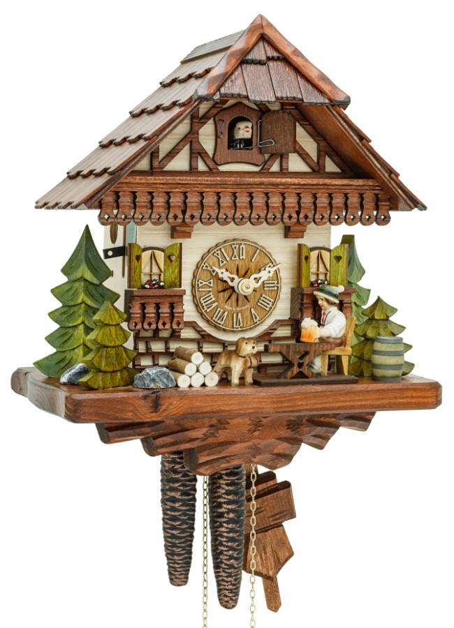 • Koekoeksklok met opgelegd vakwerkdak, bewegende bierdrinker, sint Bernardshond, dennenbomen, biervat, stenen en houtstapel.