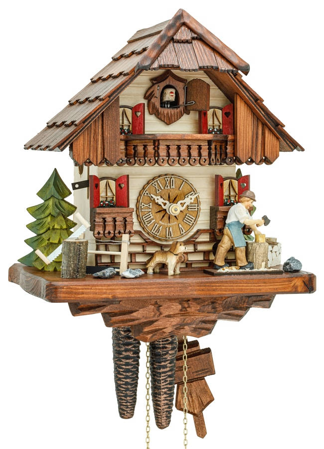 • Koekoeksklok met opgelegd vakwerkdak, bewegende houthakker, sint Bernardshond, dennenbomen, zaag, stenen en houtstapel.