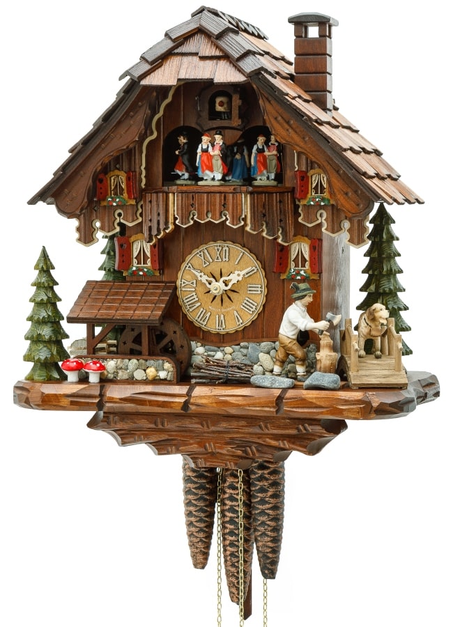 Deze koekoeksklok is uitgerust met een 1-daags mechanisch uurwerk dat functioneert op drie gewichten, die eenmaal per dag moeten worden opgetrokken. Het uurwerk maakt gebruik van een verfijnd systeem van tandwielen, gewichten en een slinger om de tijdsweergave en de koekoeksroep nauwkeurig aan te sturen.