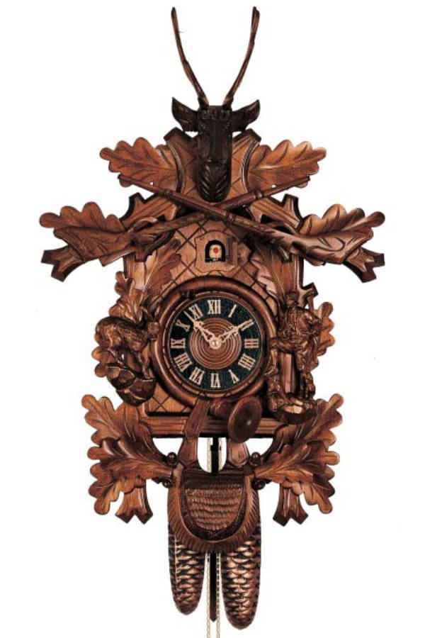 • Koekoeksklok jachttafereel met fraai snijwerk met gems, jager met hond, jachtgeweren, bladeren en hertenkop met houten gewei.