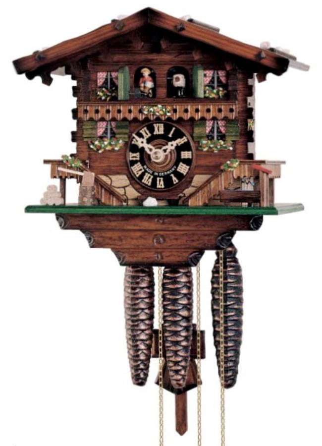De afbeelding wijkt wat af, deze koekoeksklok is iets eenvoudiger dan op de foto en heeft notenhouten gekleurde vensters, een notenhouten waterbak, een dakrand zonder snijwerk, het dak is opgelegd met stenen. Het mannetje is anders als op de foto een ober met dienblad.