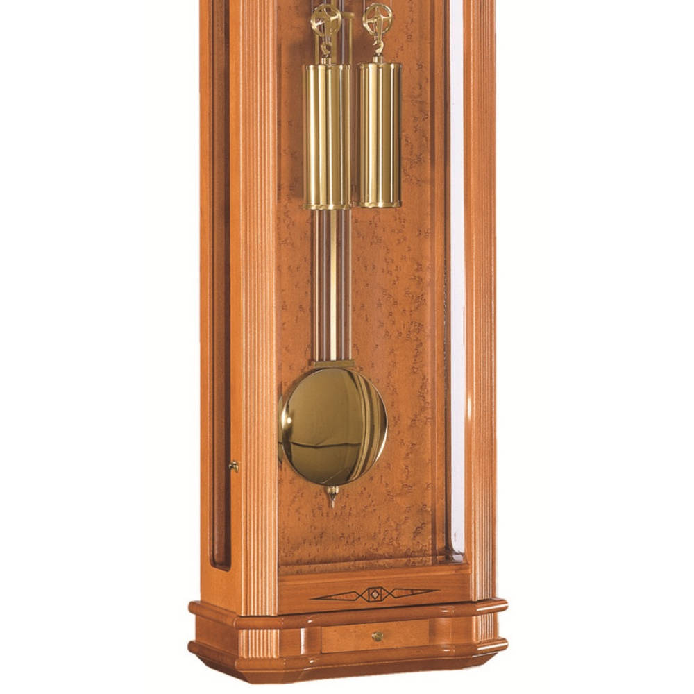 • Klok 70617-160058 is een snaarregulateur in een massieve kersenhouten uitvoering met een sleutellade en decoratieve houtinleg aan de boven- en onderkant.