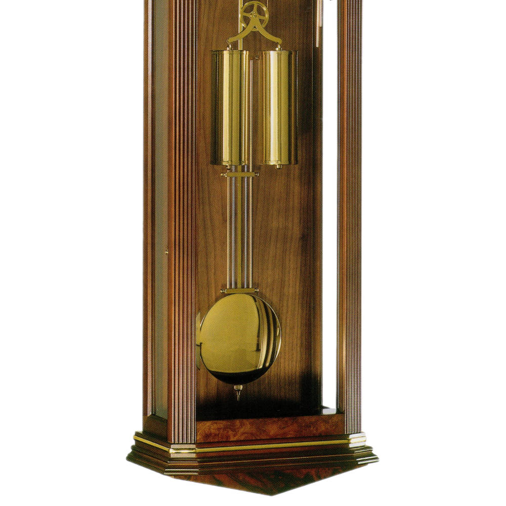 • Klok 70699-030351 is een snaarregulateur in een notenhouten uitvoering met wortelnotenhouten delen en messing sierlijsten.