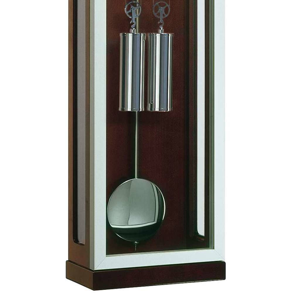• Met een glanzende chroomkleurige slinger, rand om de wijzerplaat en gewichten aan katrollen.