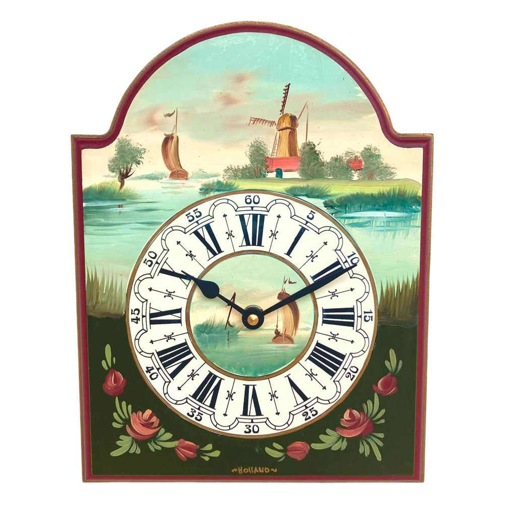 • Klok 140-801 is een handbeschilderde houten schilderij klok waarop een klassiek Hollands polderlandschap met een molen, zeilboten en water is afgebeeld.