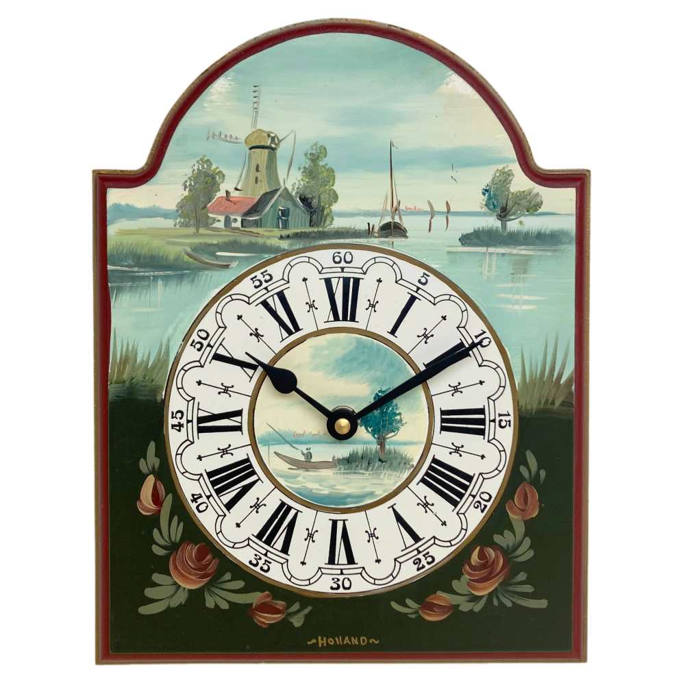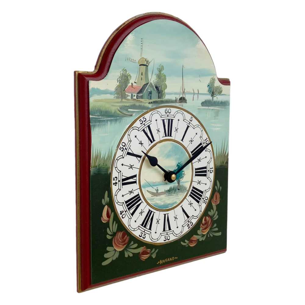• Klok 140-802 is een handbeschilderde houten schilderij klok waarop een klassiek Hollands polderlandschap met een molen, visser en zeilboten is afgebeeld.