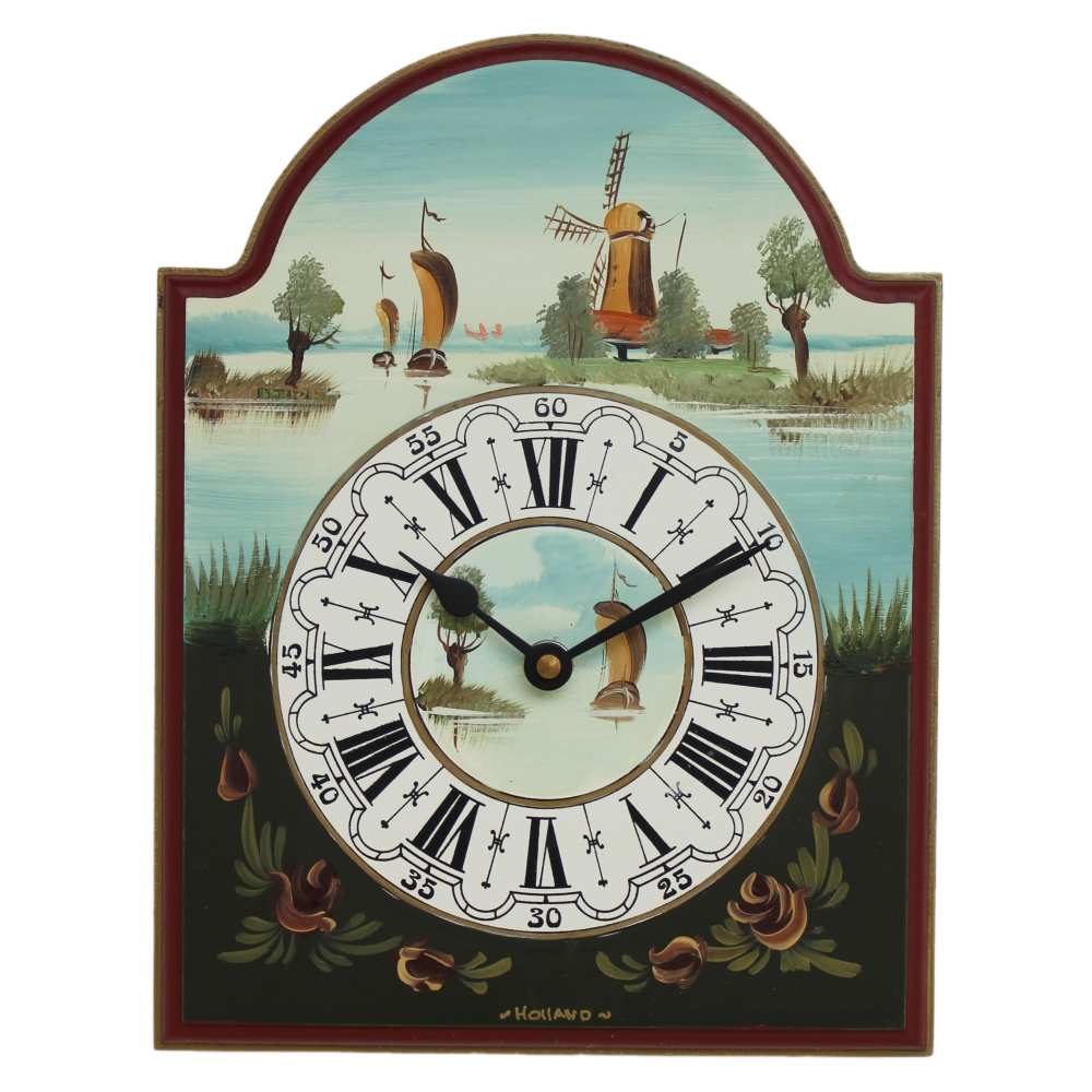 • Klok 140-806 is een handbeschilderde houten schilderij klok waarop een klassiek Hollands polderlandschap met een molen, zeilboten, bomen en water is afgebeeld.