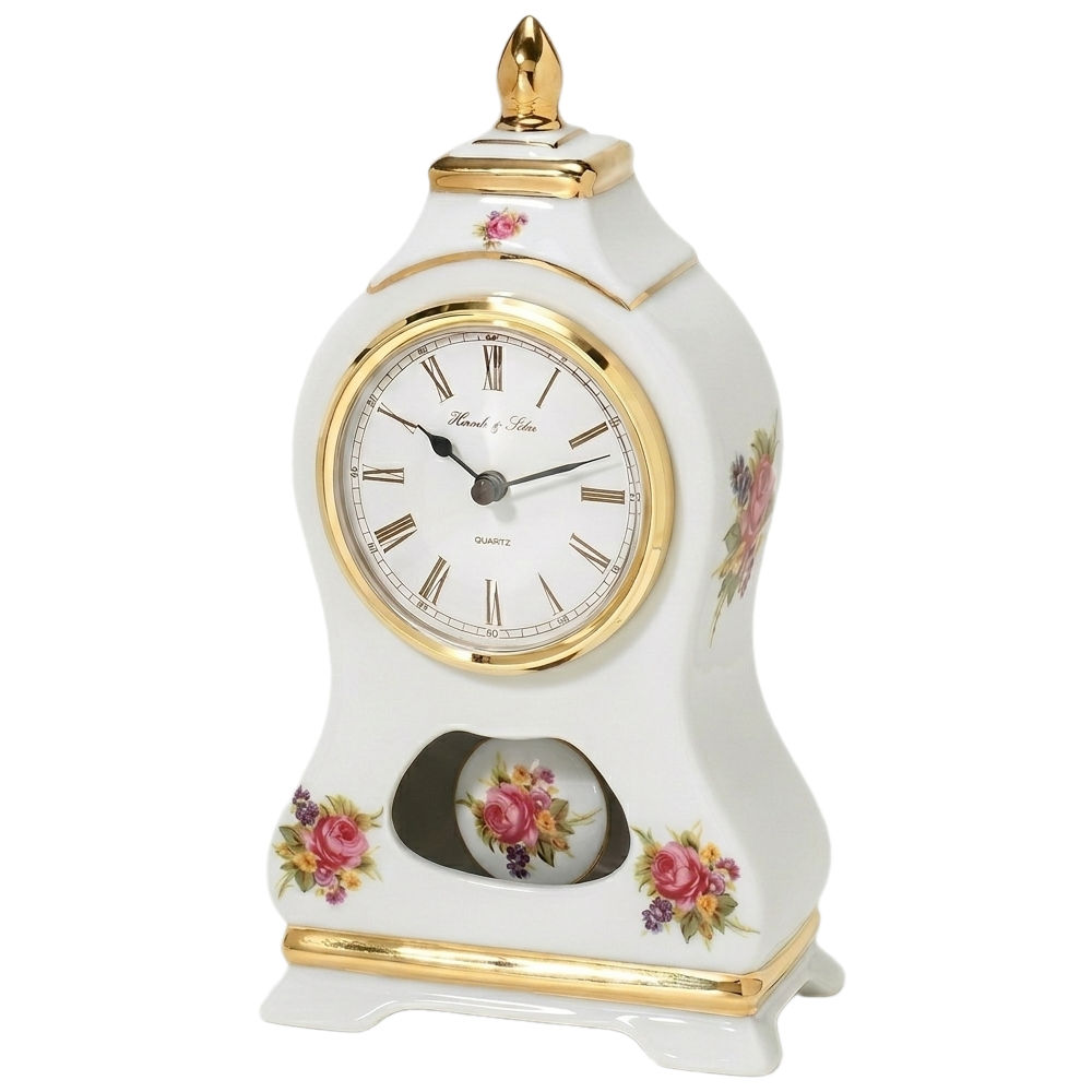 • Klok 22571-002200 is een witte porseleinen tafelklok met bloemenmotief en is beschilderd met goudkleurige biezen en bovenstuk.