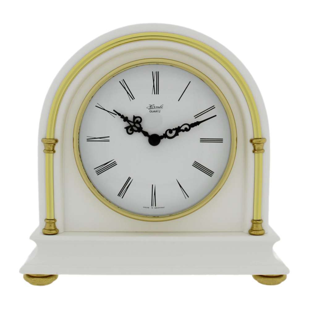• Klok 22475-250938 is een tafelklok in matte wit gelakte houten uitvoering met messing versieringen en messing pootjes.