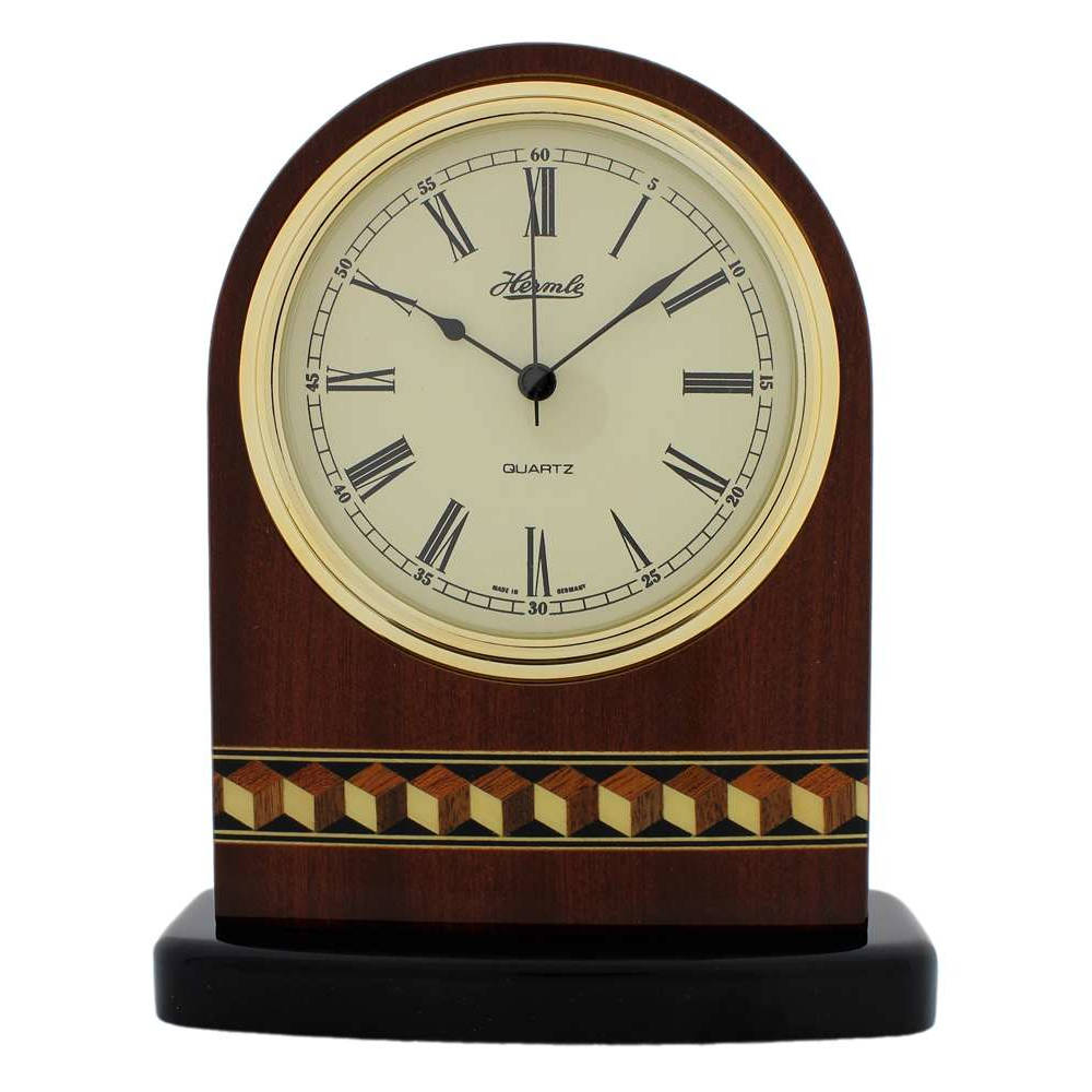 • Klok 22699-072600 is een tafelklok van mahoniehout met een motief ingelegd en een zwart gelakte houten voet.