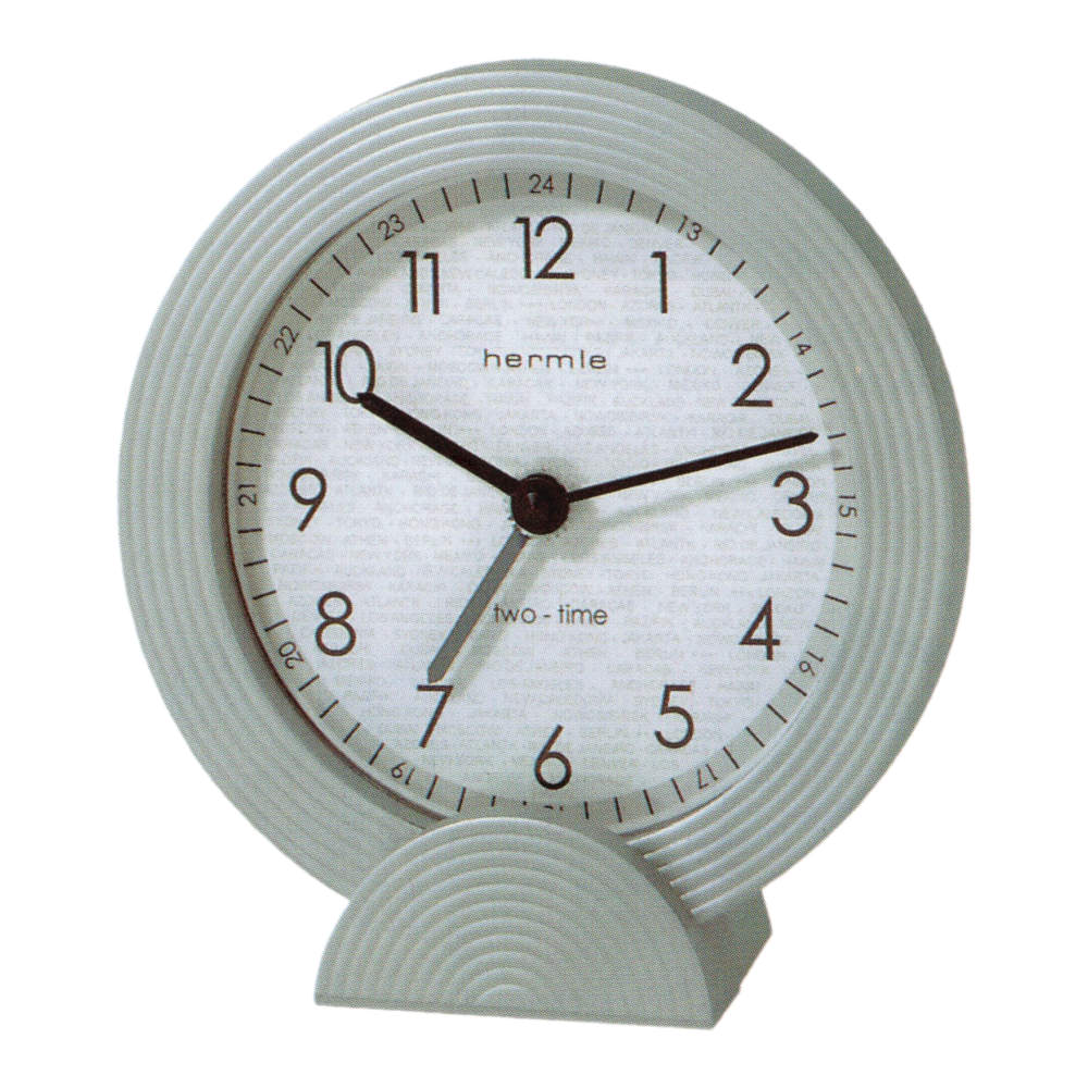 • Klok 22738-002100 is een mat zilverkleurige tafelklok met een kunststof behuizing en wijzerplaat die is bedrukt met 24-uurs aanduiding en wereldsteden.