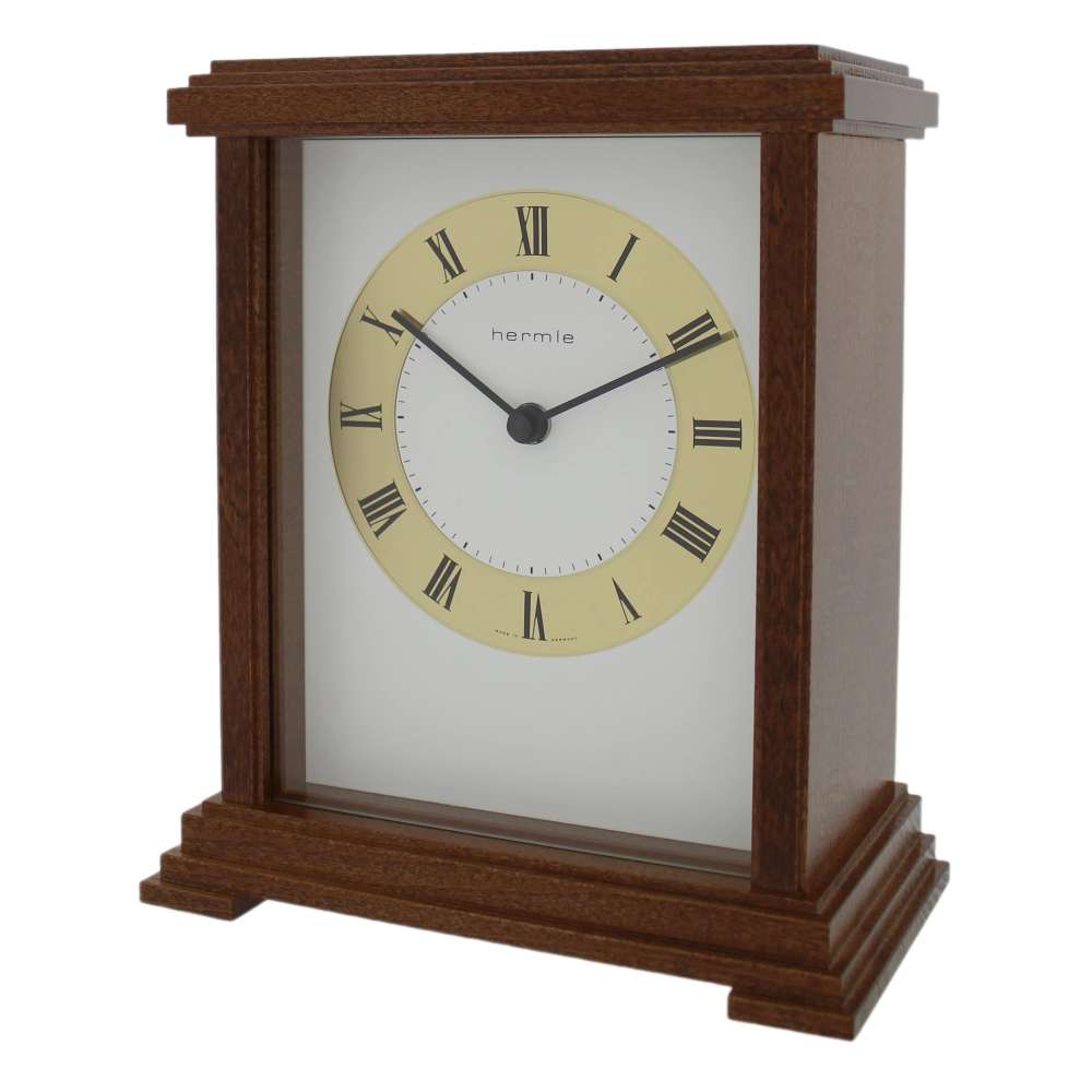 • Klok 22872-032114 is een tafelklok in een noten gelakte houten uitvoering met een mineraalglas aan de voorkant.