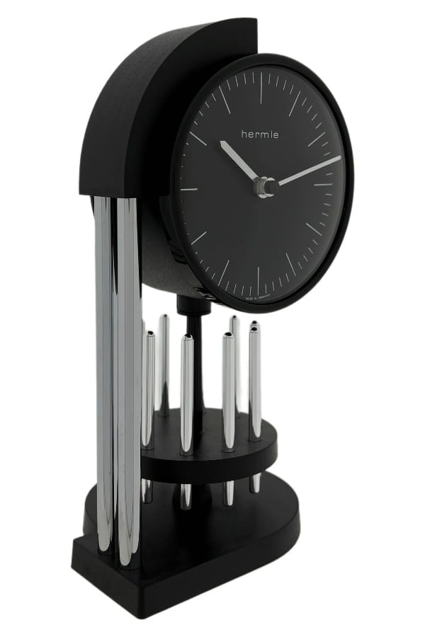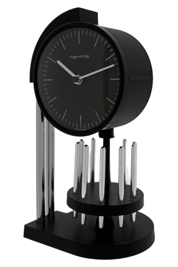 • Klok 89006-002300 is een design tafelklok in een mat zwarte kunststof uitvoering met zilverkleurige pilaren en een draaislinger met zilverkleurige staven.