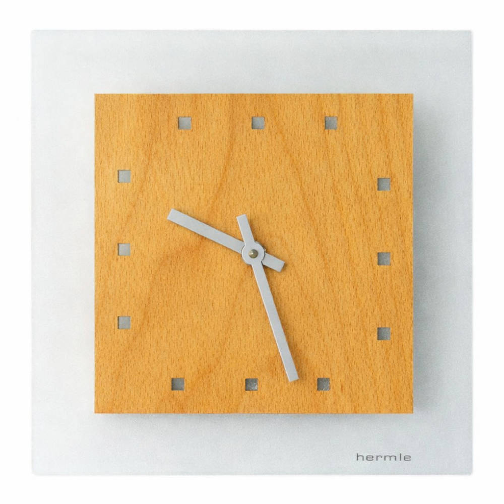 • Het mineraalglas is opgelegd met een beukenhouten wijzerplaat waarbij de vierkante urenmarkeringen zijn uitgefreesd.