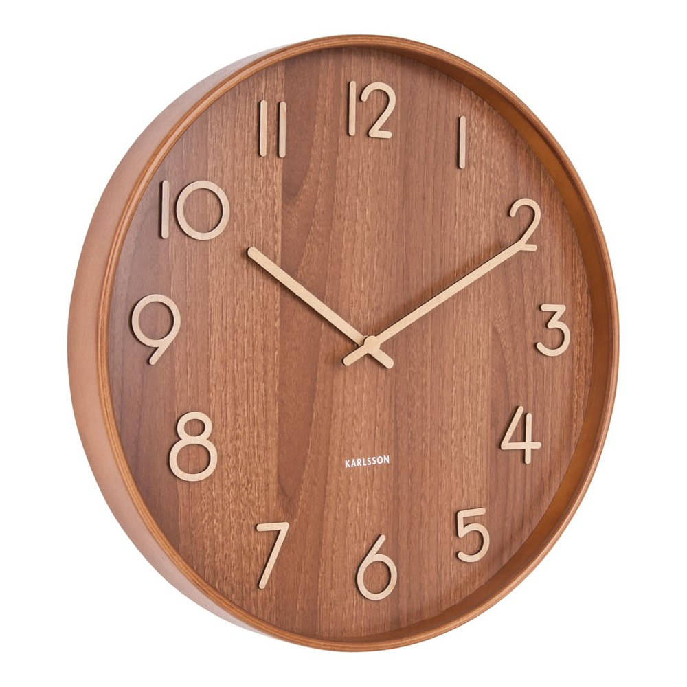 • Klok KA5809DW is een wandklok met een midden eiken gekleurde houten rand en wijzerplaat waarop lichtkleurige houten cijfers zijn opgelegd.