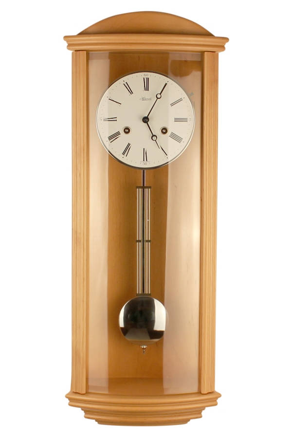 • Klok 70652-320141 is een regulateur wandklok in een massief elzenhouten uitvoering met een zilverkleurige aluminium slinger en rand om de wijzerplaat.