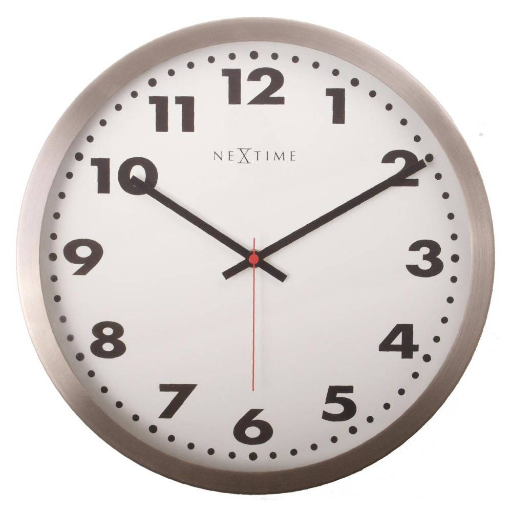 • Klok NE2521 is een wandklok met een matte geborstelde RVS rand en een witte wijzerplaat met duidelijke zwarte opgedrukte cijfers.