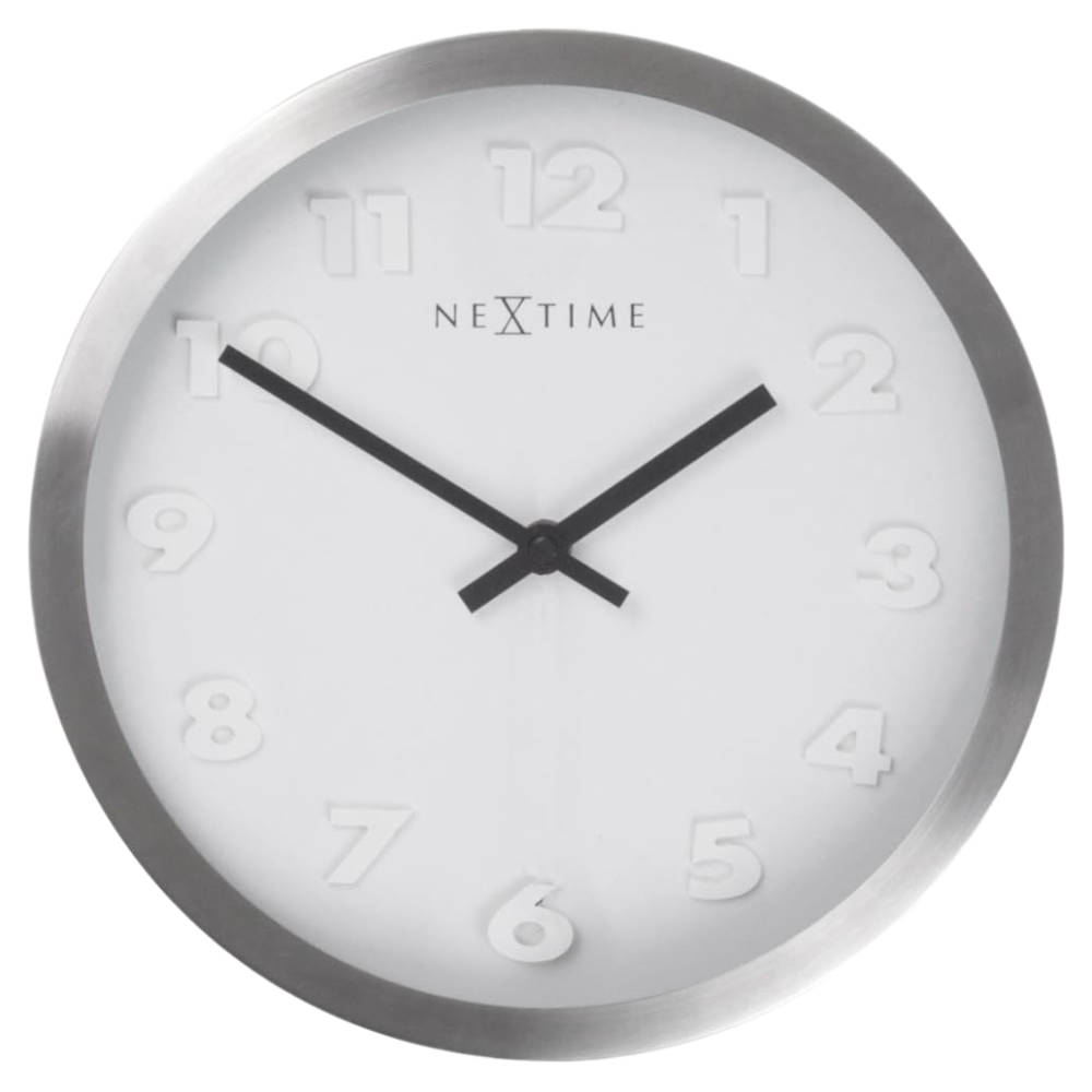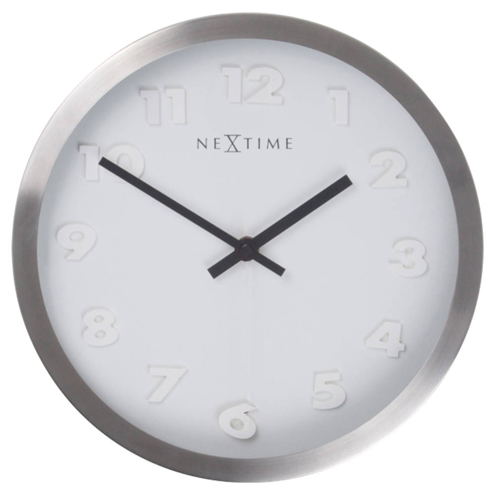 • Klok NE2991AR is een wandklok met een matte geborstelde RVS rand en een witte wijzerplaat met witte opgelegde cijfers.