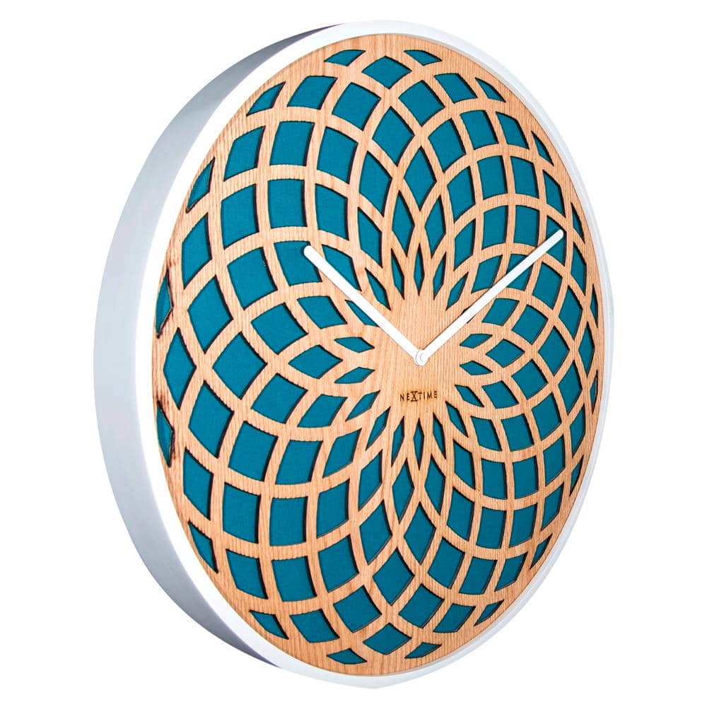• Klok NE3150TQ is een wandklok met een wit gelakte houten rand en een wijzerplaat van turquoisekleurig stof.