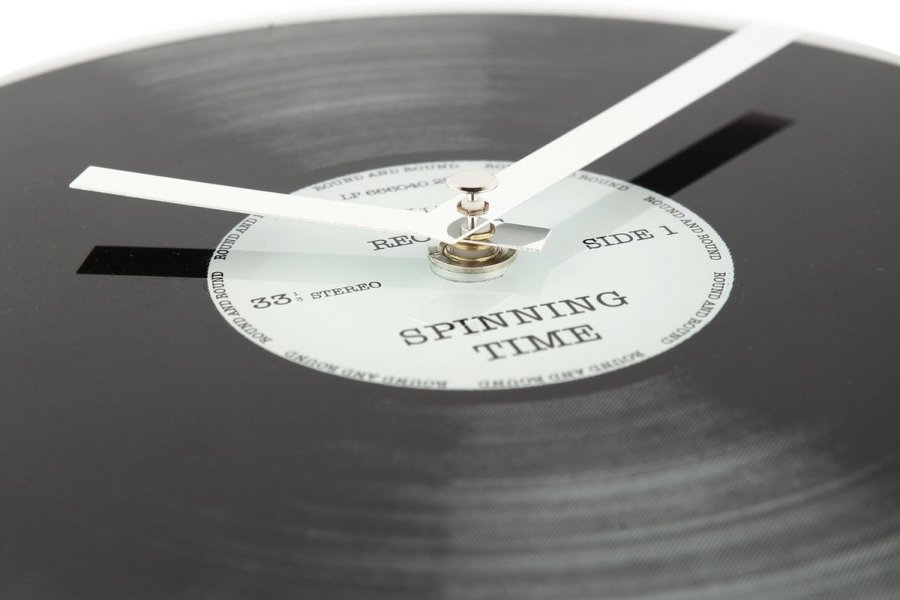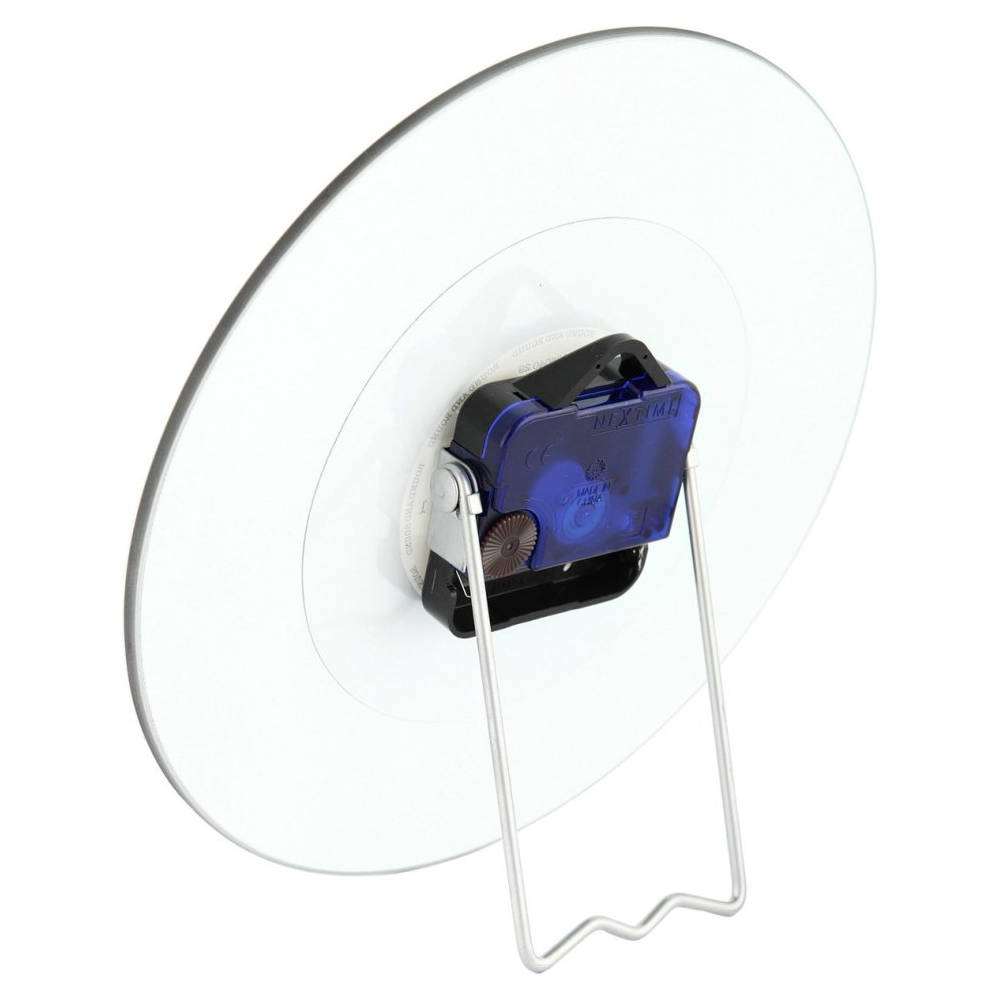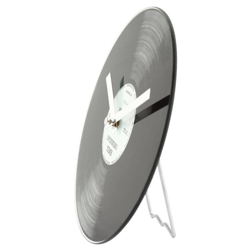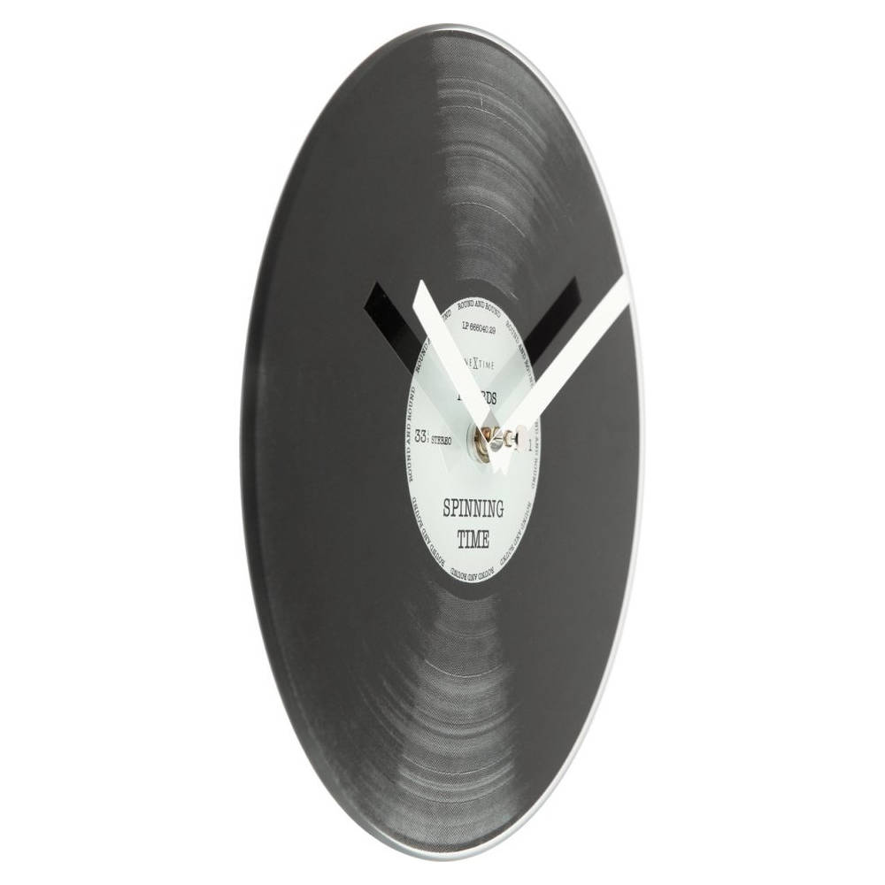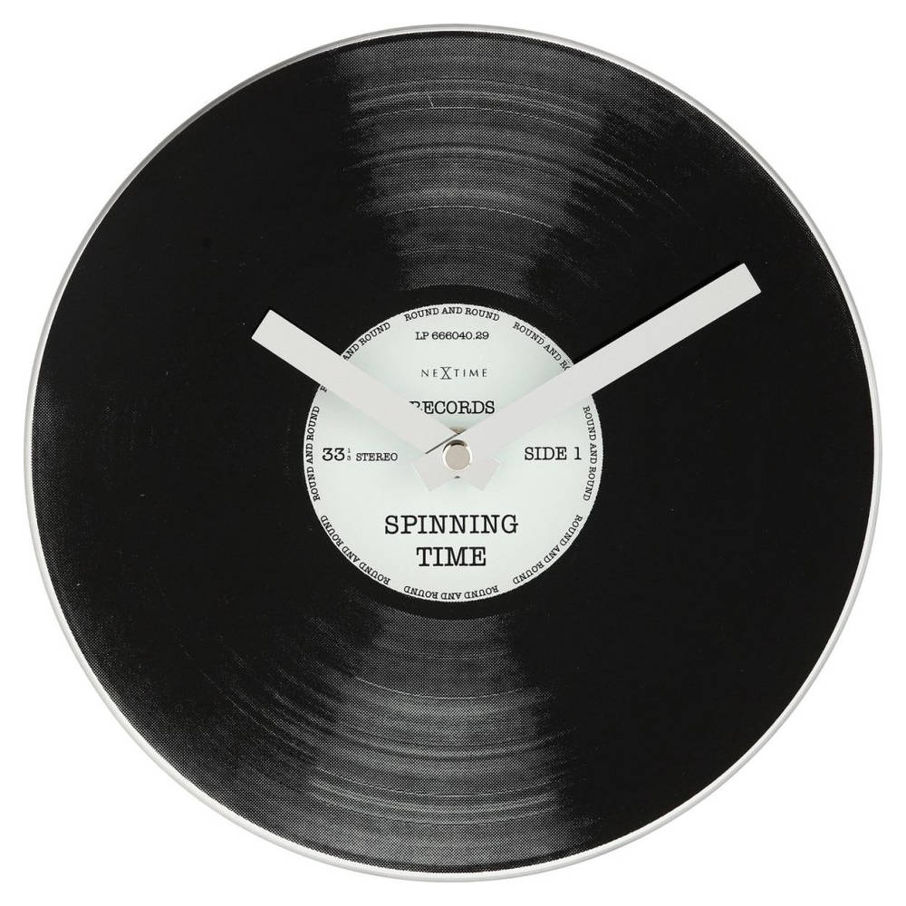 • Klok NE5163 is een kleine lp klok van bedrukt glas met vinyl motief, tekstlabel en glanzende zilverkleurige metalen wijzers.