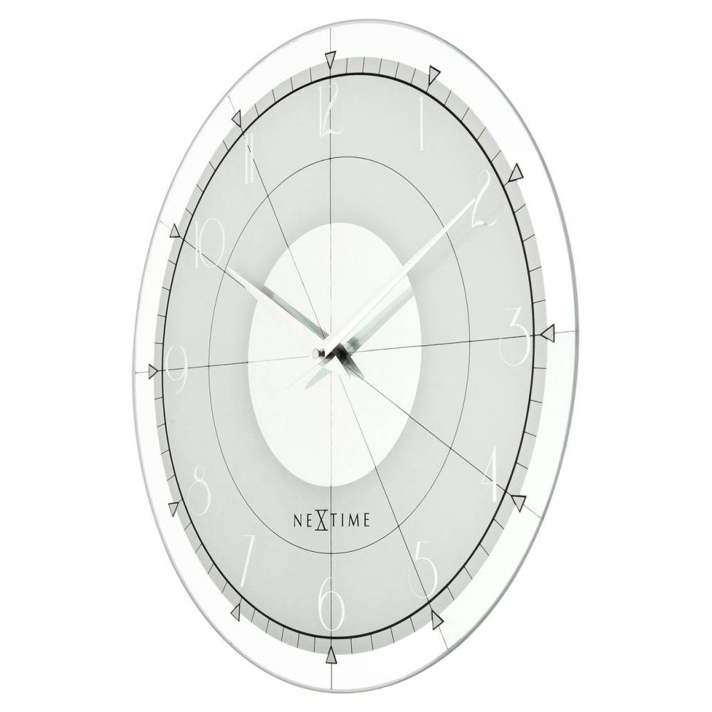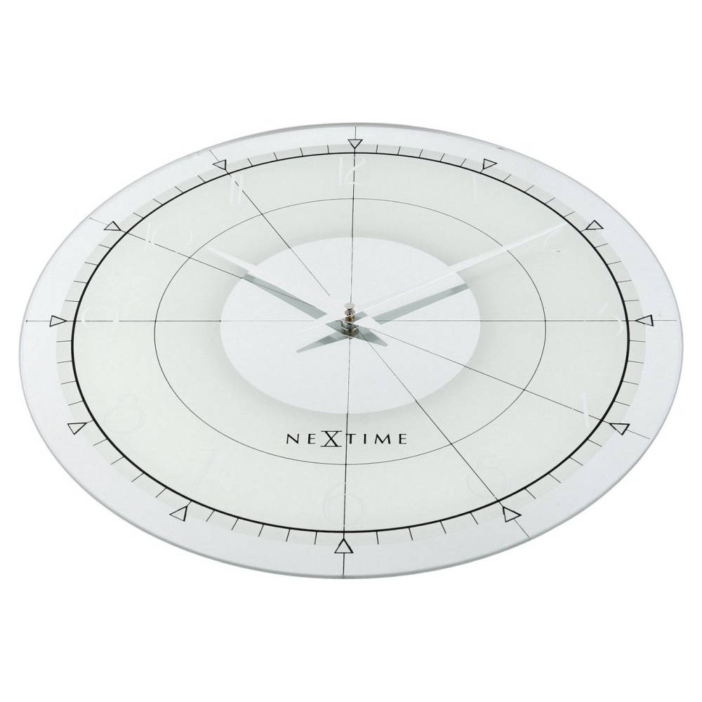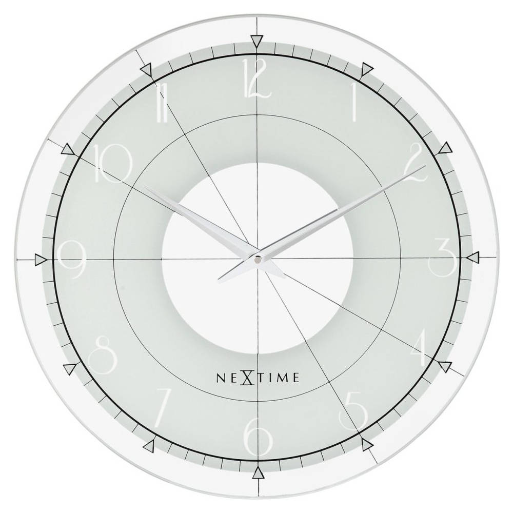 • Klok NE8125 is een wandklok van glanzend zilverkleurig spiegelglas, opgedrukt met een mat witte cijferrand.
