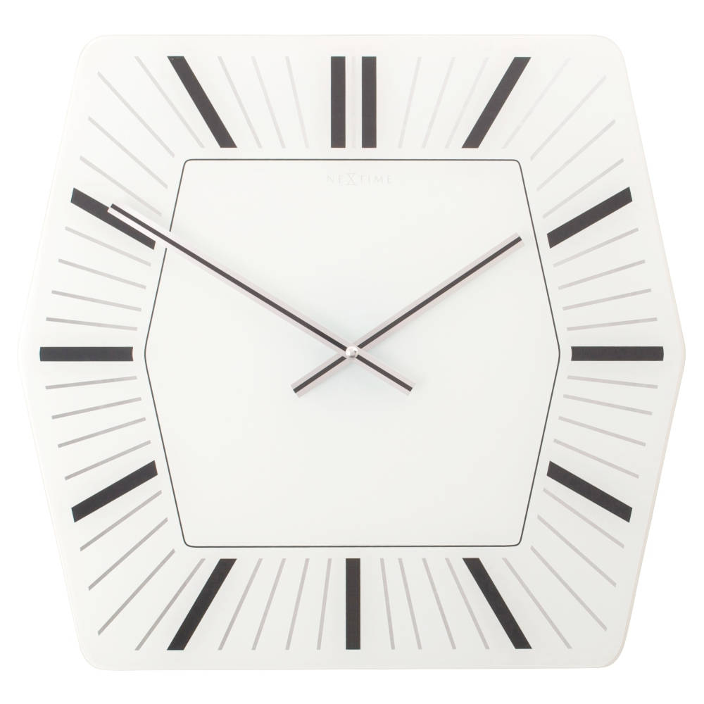 • Klok NE8128WI is een wandklok van wit bedrukt glas met zwarte urenmarkeringen en glanzend zilverkleurige minutenmarkeringen van spiegelglas.