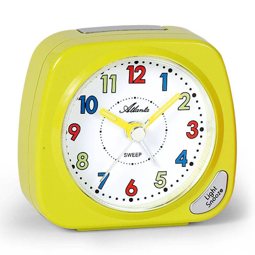 • Wekker 1936-2A is een lichtgroene kinderwekker met een witte wijzerplaat waarop verschillende kleuren cijfers zijn opgedrukt.