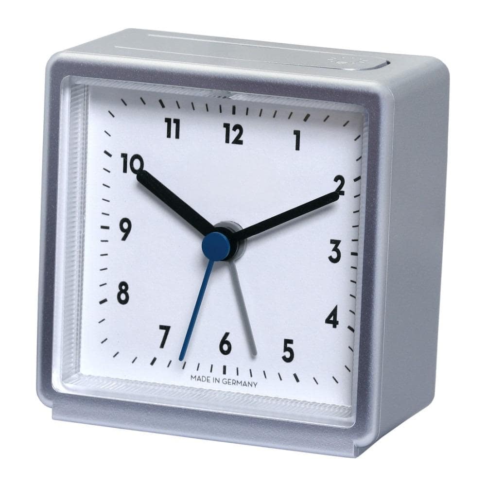 • Wekker 0540-19 is een kleine metallic zilverkleurige kunststof wekker met aan de zijkant een blauwe alarmschakelaar.