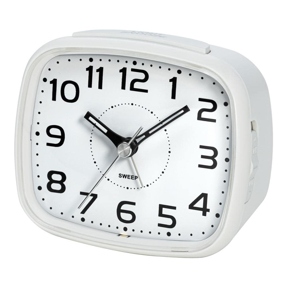 • Wekker 0604-0 is een witte kunststof wekker met een witte wijzerplaat, zwarte opgedrukte cijfers en zwarte open wijzers.